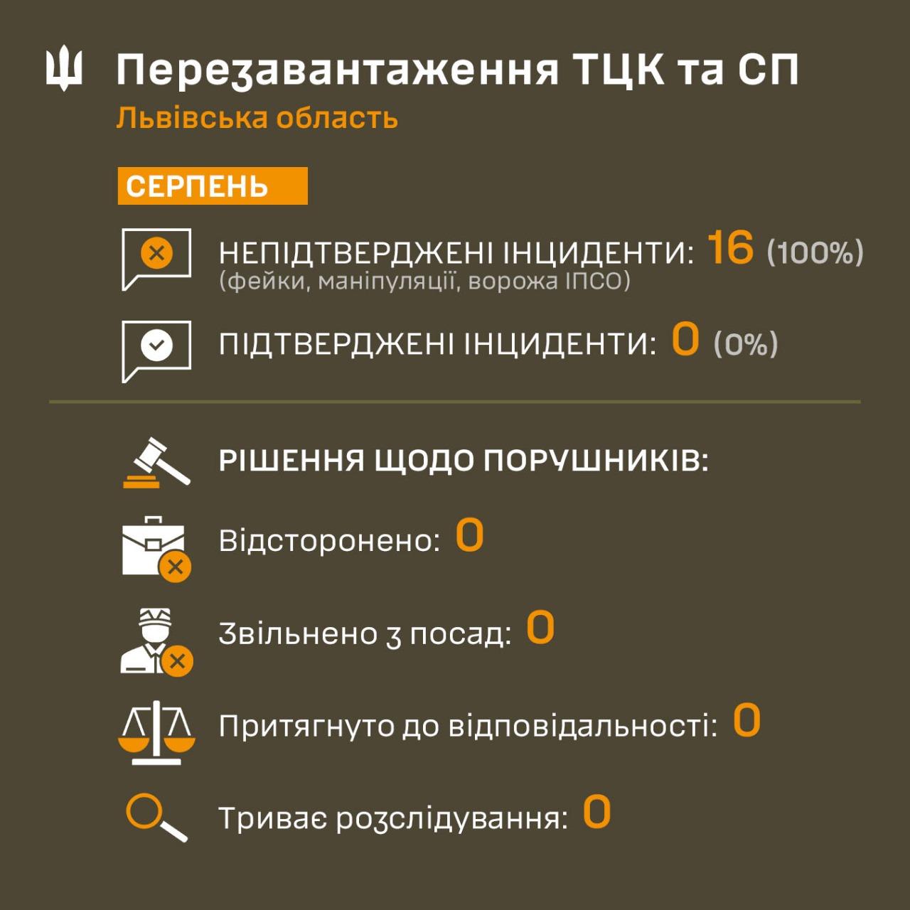 "16 інцидентів (100%) не підтвердилися - йдеться про випадки, що виявилися фейками, перебільшеннями або елементами ворожої інформаційно-психологічної операції (ІПСО). Наведені цифри - це відповідь на запит суспільства. Система реагує. Порушення не замовчуються. Не закликайте - фільтруйте інформацію руку ворогові", - заявляє військкомат.