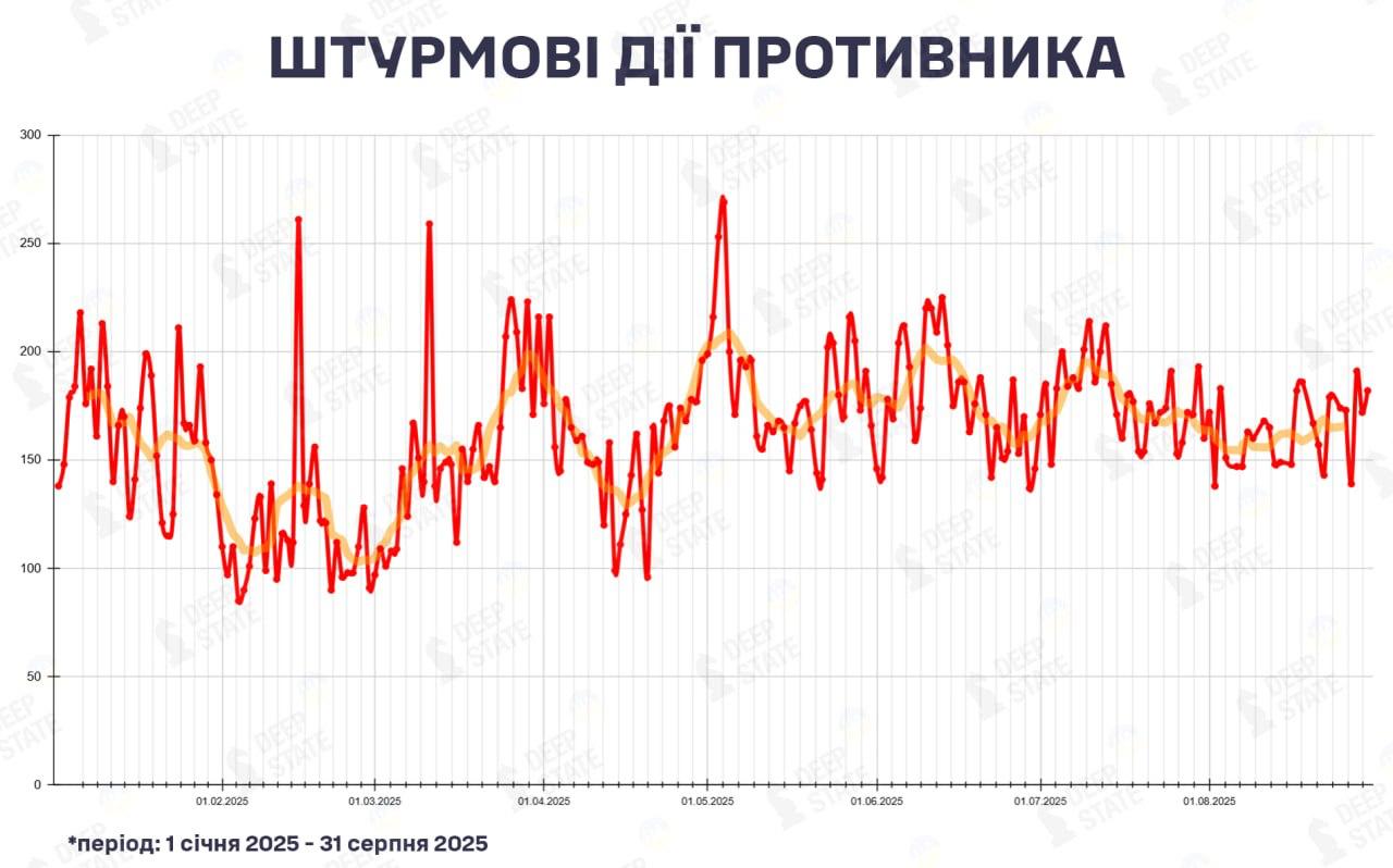 15.36 Армія РФ у серпні менш активно наступала, ніж у липні, червні та травні і провела близько 5027 штурмових дій, повідомляє Deep State.