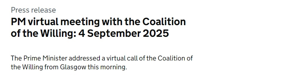 "Обговорюючи останні військові плани "коаліції бажаючих", прем'єр-міністр наголосив, що група взяла на себе непорушне зобов'язання перед Україною, підтримане президентом Трампом, і тепер очевидно, що їм необхідно піти ще далі, щоб чинити тиск на Путіна та домогтися припинення бойових дій", - зазначається у прес-релізі.