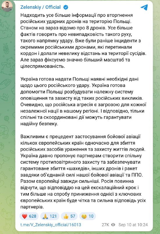 "Все більше фактів говорять про невипадковість такого руху, такого напряму удару. Вже були раніше інциденти з окремими російськими дронами, що перетинали кордон і долали невелику відстань на території сусідів. Але зараз фіксуємо набагато більший масштаб і цілеспрямованість. Росія повинна відчути, що відповіддю на цей екскалійний крок і тим більше сильна відповідь усіх партнерів", - написав Зеленський.