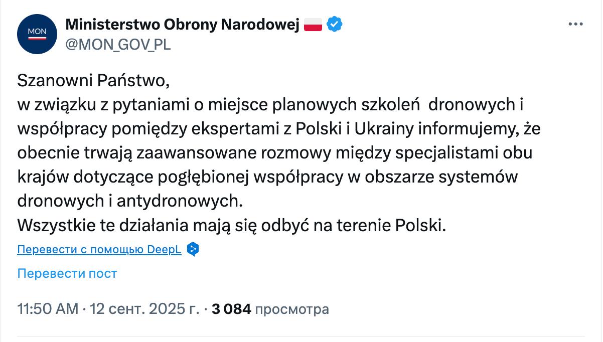 "У зв'язку з питаннями про місце проведення запланованих тренінгів з дронів та співробітництва між експертами з Польщі та України повідомляємо, що наразі ведуться активні переговори між фахівцями обох країн щодо розширення співробітництва в галузі дронних та антидронних систем. Усі ці заходи мають відбутися на території Польщі", - йдеться у повідомленні.