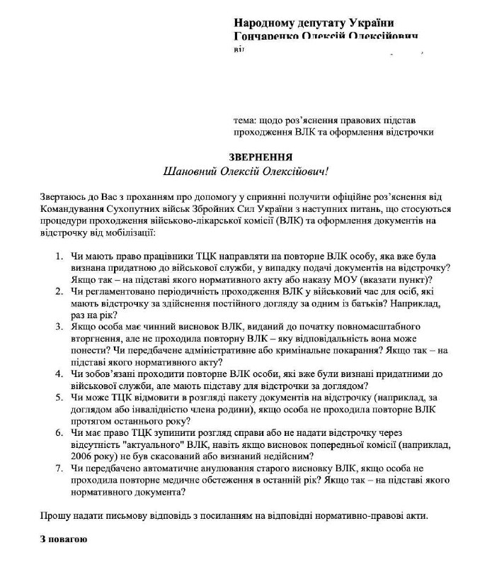 "Головне з цієї відповіді: якщо вже визнали придатним без обмежень, проходити ВЛК щороку не потрібно. Стара ВЛК не анулюється автоматично. Відмовити у відстрочці через несвіжі результати ВВК не мають права. Відповідальності за непроходження ВЛК раз на рік законом немає. Повторно спрямовують на ВЛК лише вимоги: якщо ви зробили нову вимогу: або тих, кого визнали обмеженими. ВЛК щороку – це зловживання. Закон цього не вимагає", - написав Гончаренко у своєму телеграм-каналі.