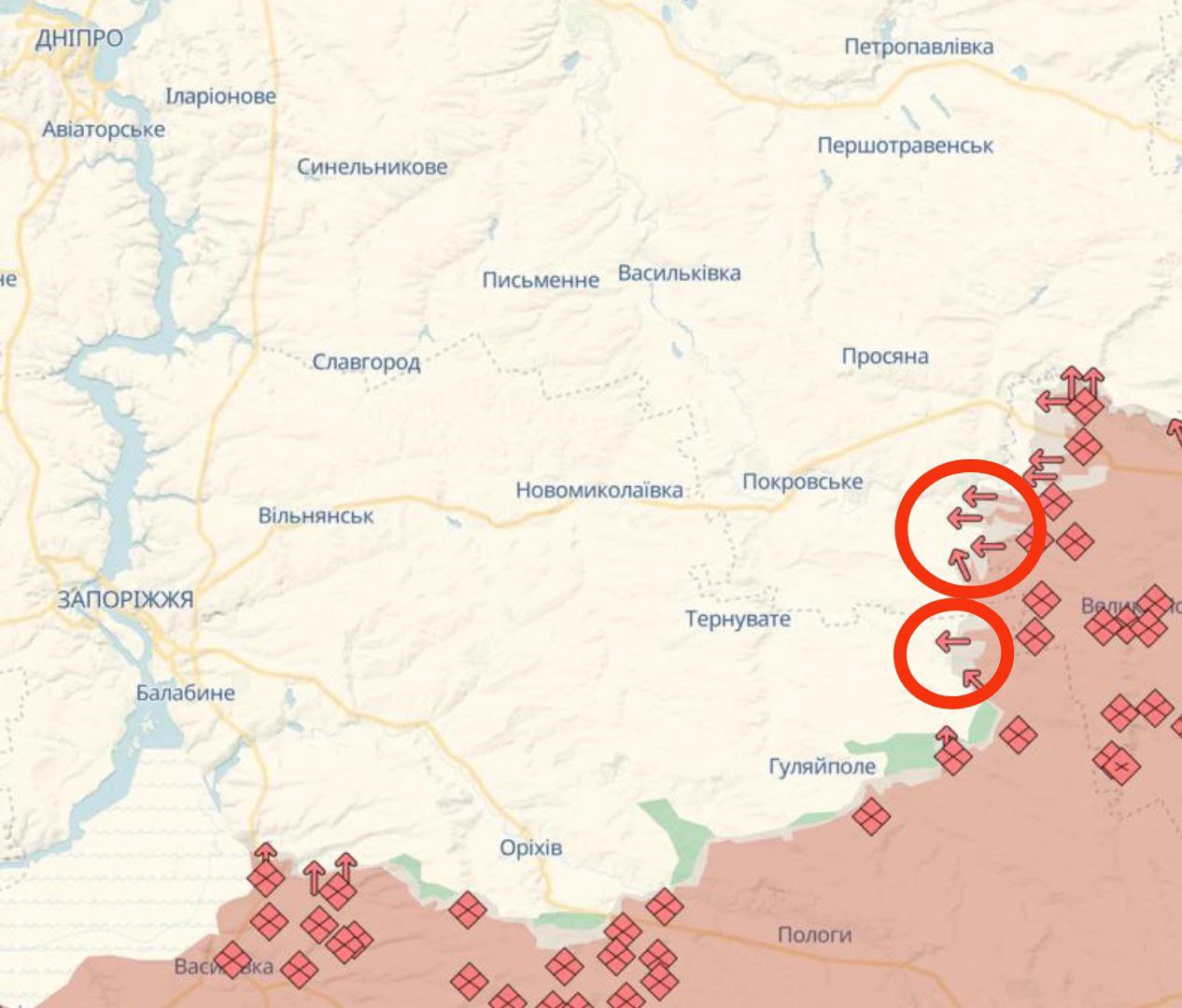 Проте українські військові паблики фіксують поступ РФ на Дніпропетровщині. Нехай і не "стрімке", але у щоденному режимі. Бої точаться на двох основних ділянках.