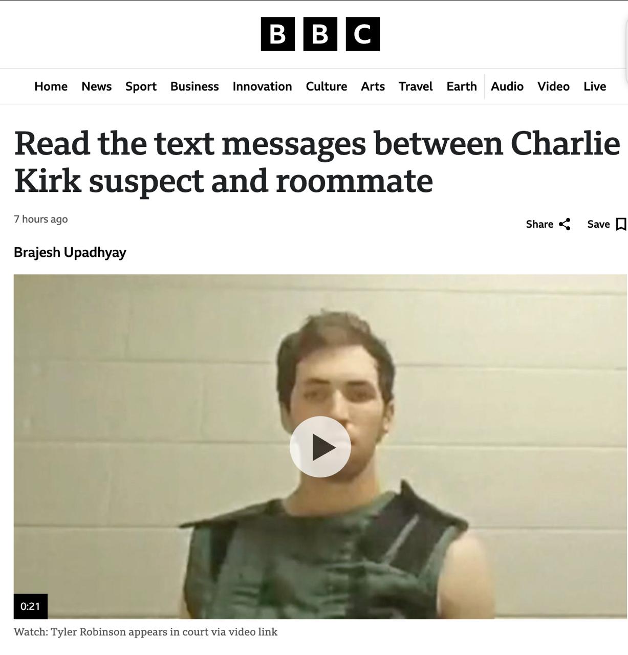 З'явилося листування підозрюваного у вбивстві американського консервативного активіста Чарлі Кірка 22-річного Тайлера Робінсона з коханцем-трансгендером, з яким він жив в одній кімнаті і ім'я якого не розкривається.