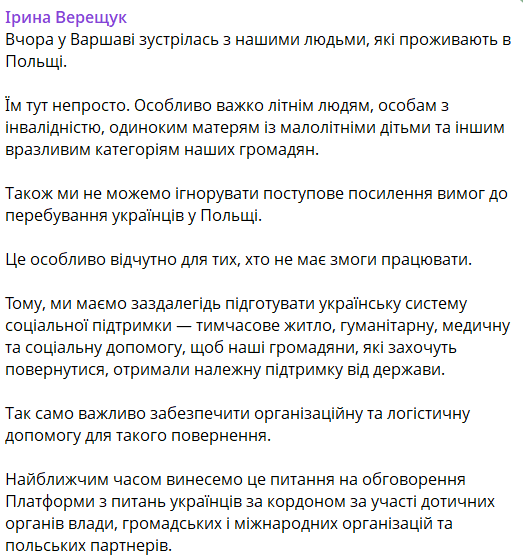 "Також ми не можемо ігнорувати поступове посилення вимог до перебування українців у Польщі. Це особливо відчутно для тих, хто не має можливості працювати. Тому ми маємо заздалегідь підготувати українську систему соціальної підтримки", - наголосила вона.