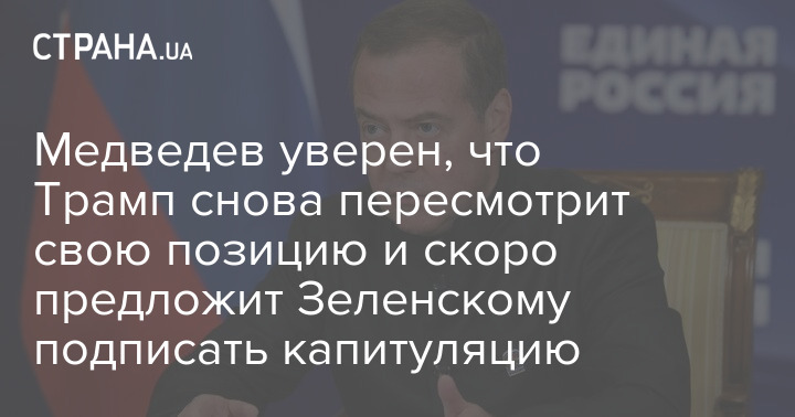 Заступник голови Ради Безпеки Російської Федерації Дмитро Медведєв висловив упевненість у тому, що президент США Дональд Трамп знову змінить свої погляди та незабаром запропонує Володимиру Зеленському підписати капітуляцію.