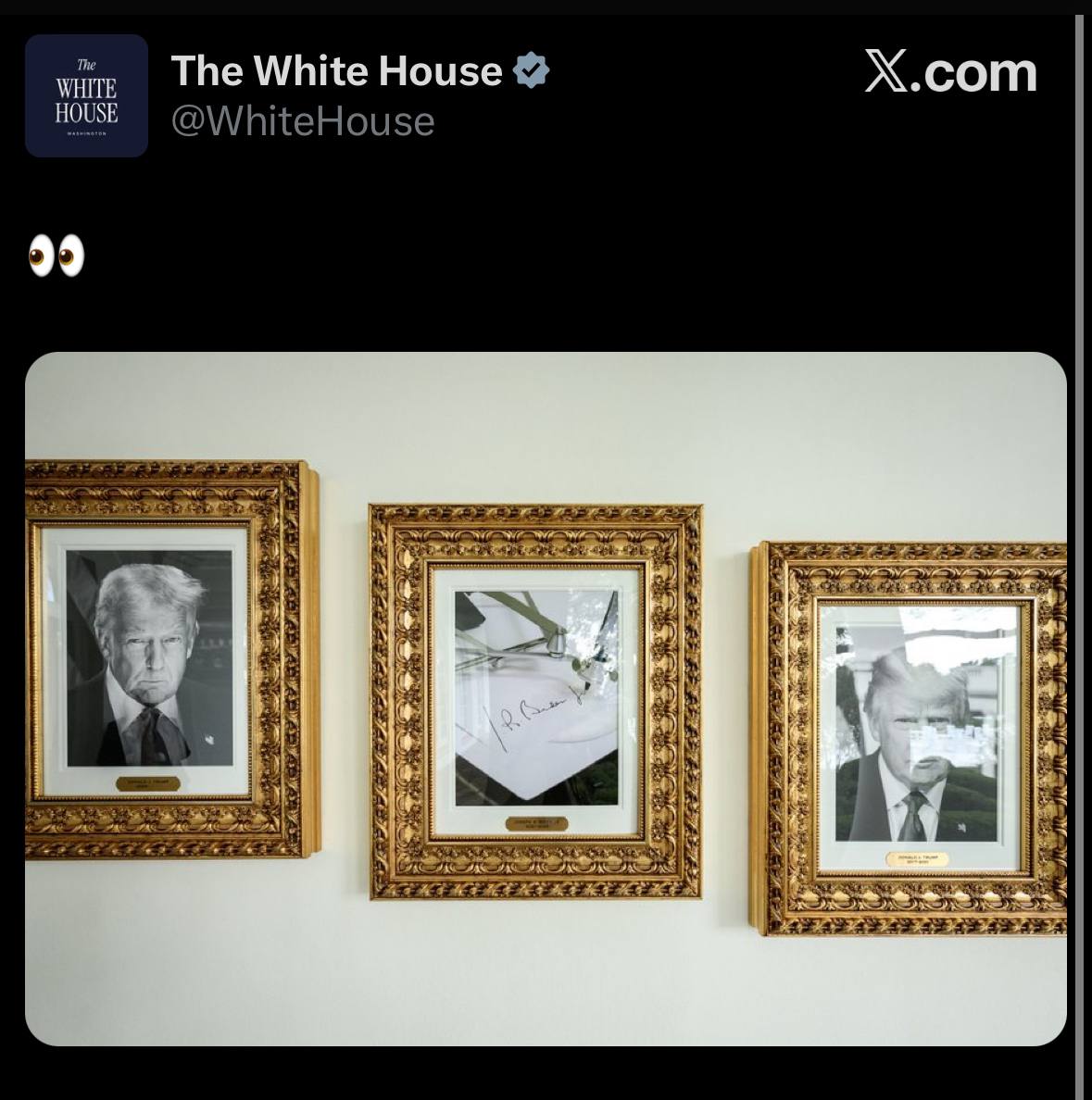 На опублікованих кадрах можна побачити, як серед портретів колишніх лідерів США, включаючи Барака Обаму, наразі розміщено фото апарату з підписом Байдена.