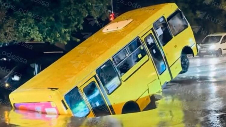 Маршрутний автобус в Одесі пішла під землю через прорив теплотраси на тлі зливи, що вирувала над містом протягом усього дня.