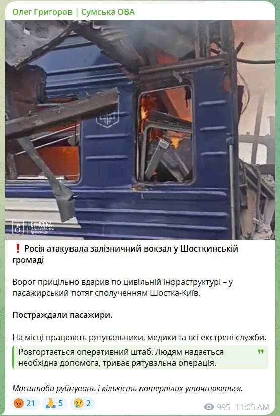 ЗС РФ атакували залізничний вокзал у Шостці, спалахнув пасажирський потяг. Відео