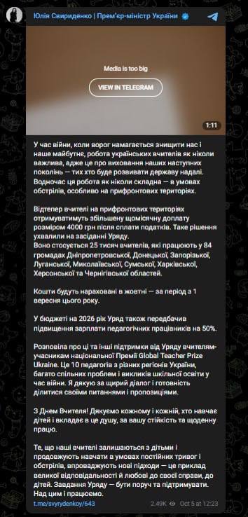"Під час війни, коли ворог намагається знищити нас і наше майбутнє, робота українських вчителів як ніколи важлива. Те, що вони залишаються з дітьми, впроваджують нові підходи до навчання, незважаючи на постійні тривоги – це приклад великої відповідальності та любові до своєї справи", – зазначила Свириденко.