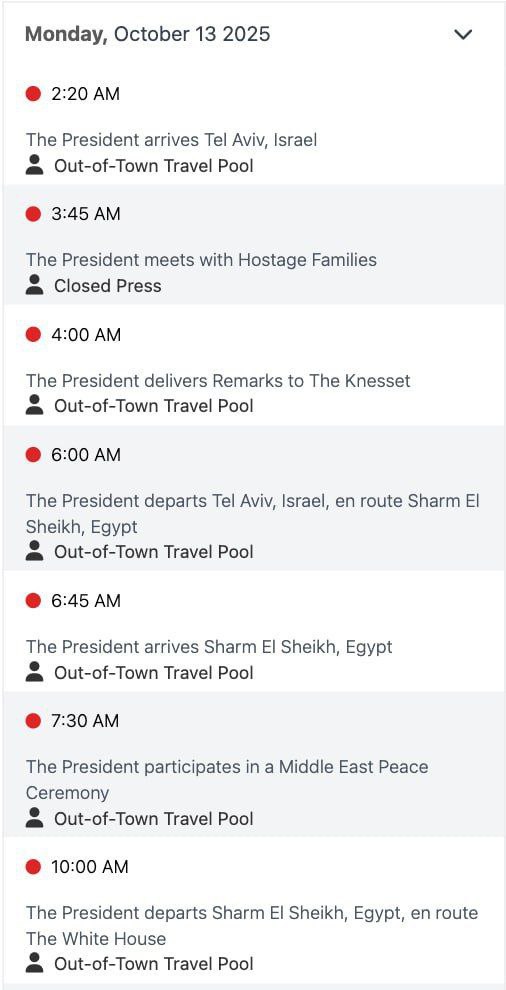 "О 13:30 того ж дня президент США вирушить з Ізраїлю до єгипетського Шарм-еш-Шейху. Там він візьме участь у церемонії формального затвердження мирної угоди між Ізраїлем і ХАМАСом. Після цього глава Білого дому вилетить до Вашингтона", - йдеться в оприлюдненому Білим будинком графіку.