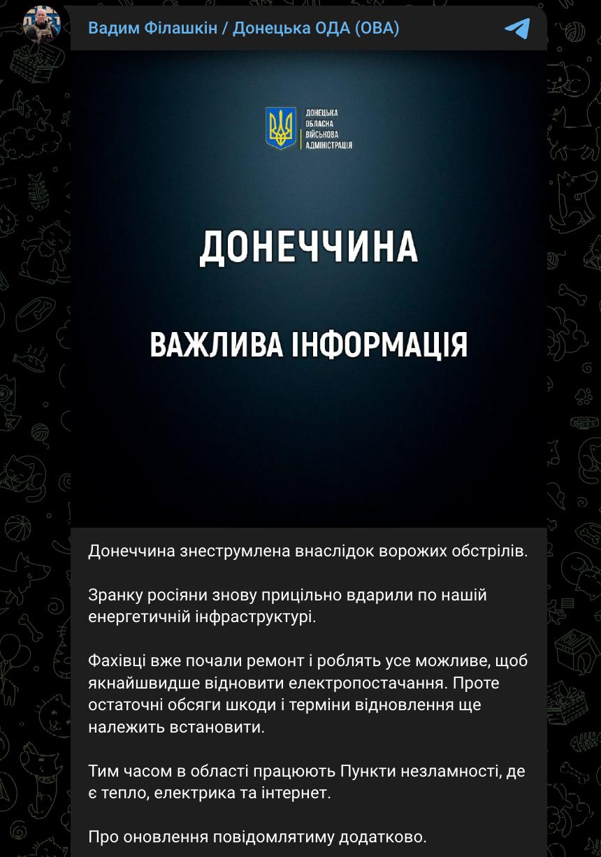 8:21 Донецька область (підконтрольна Україні частина) залишилася без світла після ранкового удару по енергетиці.