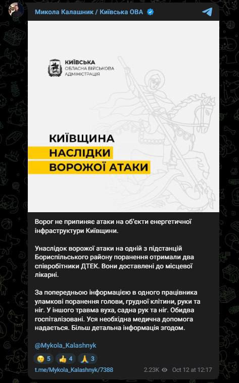 13:28 Росія атакувала підстанції у Бориспільському районі Києва. Поранено двох співробітників ДТЕК.