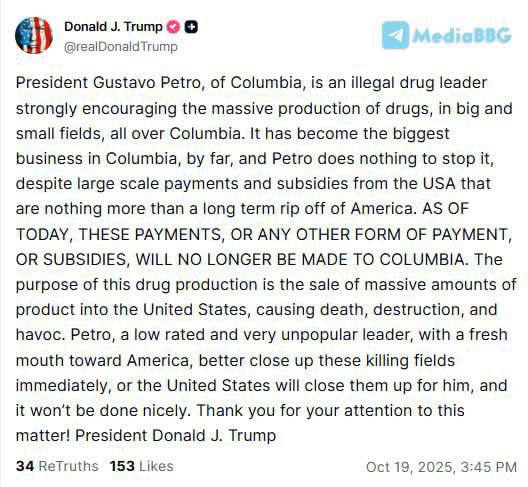 "Президент Густаво Петро з Колумбії є лідером незаконного обігу наркотиків і активно заохочує масове виробництво наркотиків на великих і малих плантаціях по всій країні. Це стало найбільшим бізнесом в Колумбії, і Петро не вживає жодних заходів для його зупинки, незважаючи на великі виплати і субсидії з боку США, які насправді є довгостроковою "обманною схемою" для Америки. Відтепер ці виплати чи будь-які інші форми фінансової допомоги, субсидій більше не надаватимуться Колумбії", - написав Трамп.