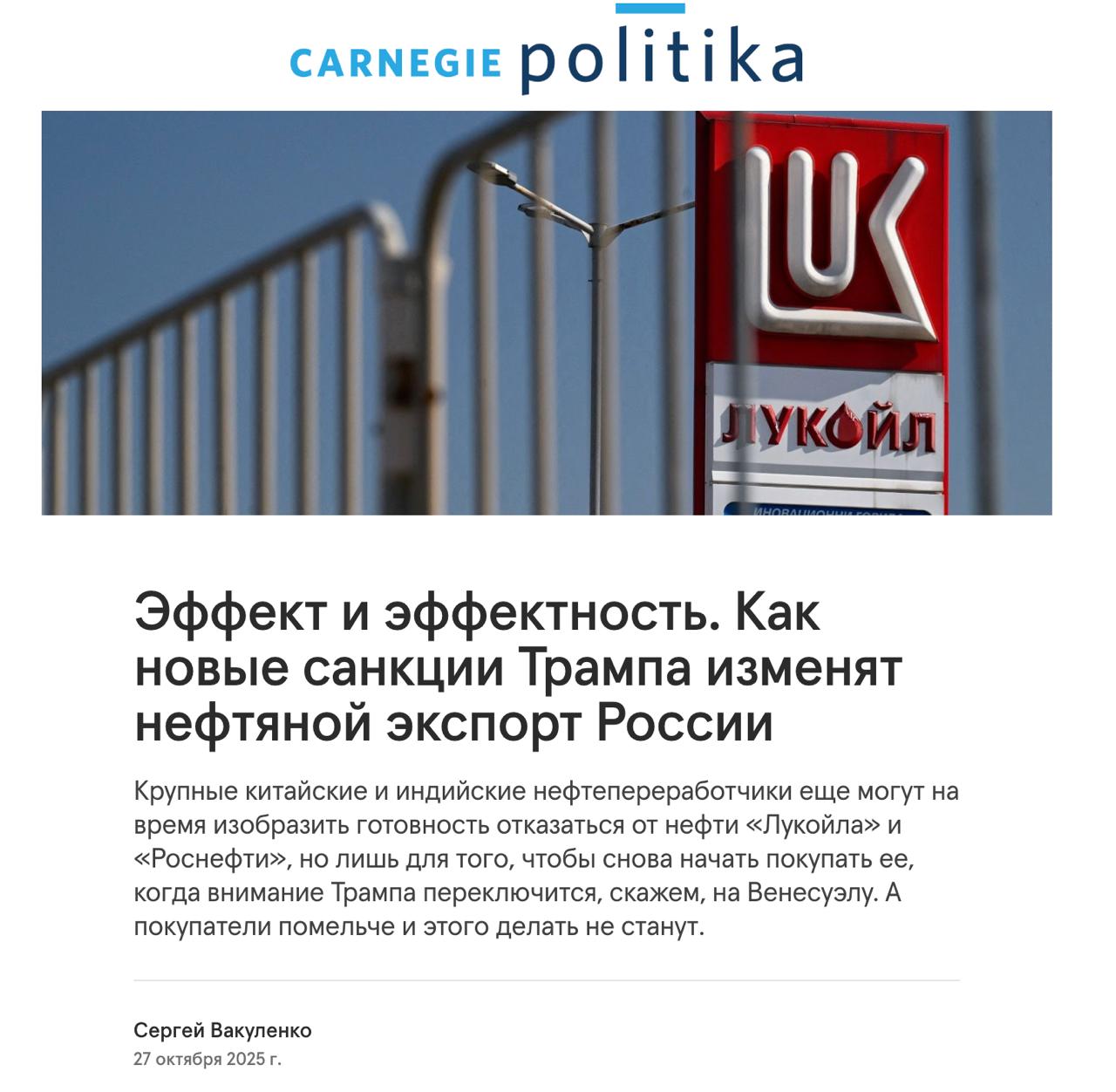 "Санкції наробили багато шуму - в основному тому, що вони стали першими, введеними після повернення Дональда Трампа до Білого дому. В іншому ж вони несуть трохи нового: "Роснефть" і "Лукойл" тепер опинилися приблизно під такими ж обмеженнями, під якими ще з 10 січня 2025 року знаходяться дві інші великі компанії. Нафта ". Січневі санкції, введені адміністрацією Джо Байдена, що йде, теж спочатку здавалися грізними. Але обсяги видобутку та експорту в обох компаній практично не знижувалися, а виросли були накладні витрати і знижки при поставках в Індію і Китай повернулися до досанкціонних значень. відправляють нафтові вантажі і від свого імені. Тому поки що немає серйозних підстав очікувати, що дві наступні нафтові компанії не зможуть впоратися з тим самим завданням», - пише Вакуленко.