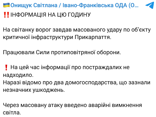 За інформацією голови Івано-Франківської ОДА Світлани Онищук, на світанку було вражено об'єкт критичної інфраструктури.