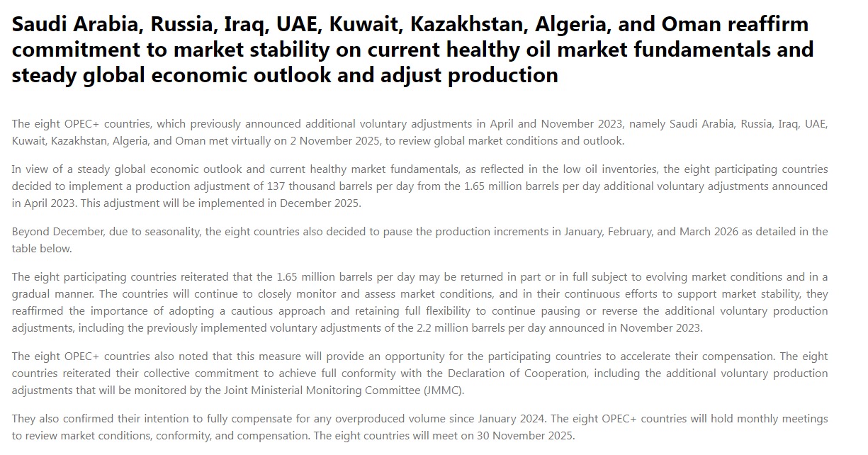 "Саудівська Аравія, Росія, Ірак, ОАЕ, Кувейт, Казахстан, Алжир і Оман провели віртуальну зустріч 2 листопада для аналізу стану та перспектив світового ринку. У зв'язку зі стабільними перспективами світової економіки і поточними сприятливими фундаментальними факторами ринку, про що свідчать низькі запаси нафти, вісім країн-7 барелів на добу в порівнянні з 1,65 мільйона барелів на добу, оголошеними в квітні 2023 року. Це коригування буде реалізовано в грудні 2025 року.
