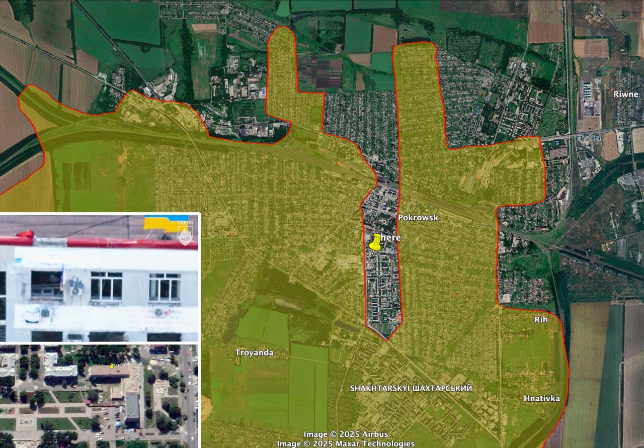 "Центр Покровська був - і, швидше за все, залишається - під контролем України. Росіяни ніколи не входили в цей район, щоб провести акцію з прапором. Українці ніколи не публікували відеозаписи ударів по росіянах у цьому районі", - коментує Репке і публікує свою карту, зроблену на основі фото та відео з фронту.