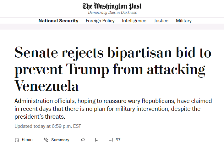 Завдяки республіканцям верхня палата конгресу США відхилила двопартійну резолюцію, спрямовану на перешкоду президенту Дональду Трампу атакувати територію Венесуели. Таким чином, сенатори від Республіканської партії де-факто схвалили масштабне застосування військової сили в Латинській Америці.