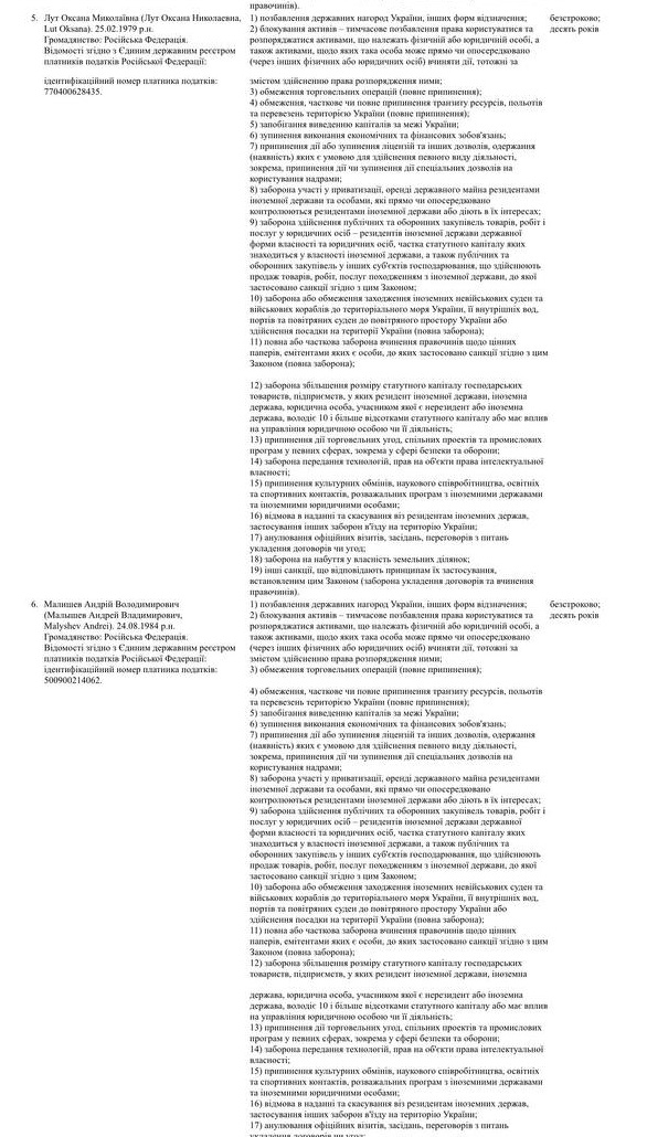 Крім того, під санкції потрапили міністр сільського господарства Росії Оксана Луї, перший заступник міністра освіти РФ Олександр Бугаєв, заступник міністра культури Андрій Малишев та заступник міністра освіти та науки РФ Андрій Омельчук.