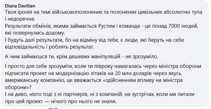 "Твоя іронія на темі військовополонених і полонених цивільних абсолютно тупа і недоречна. Результати обмінів, якими займається Рустем і команда - це понад 7000 тих, хто повернувся додому... А чим займаєшся ти, крім дешевих маніпуляцій, - незрозуміло. І просто для себе зрозуміти, коли ти півроку намагався через міністра2 яку-небудь американську компанію, це вважається "здійсненням впливу на міністра оборони"?