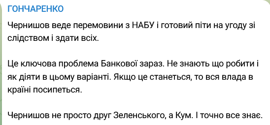 "Готовий здати всіх". Колишній віце-прем'єр Чернишов обговорює угоду зі слідством у справі Міндіча - Гончаренко