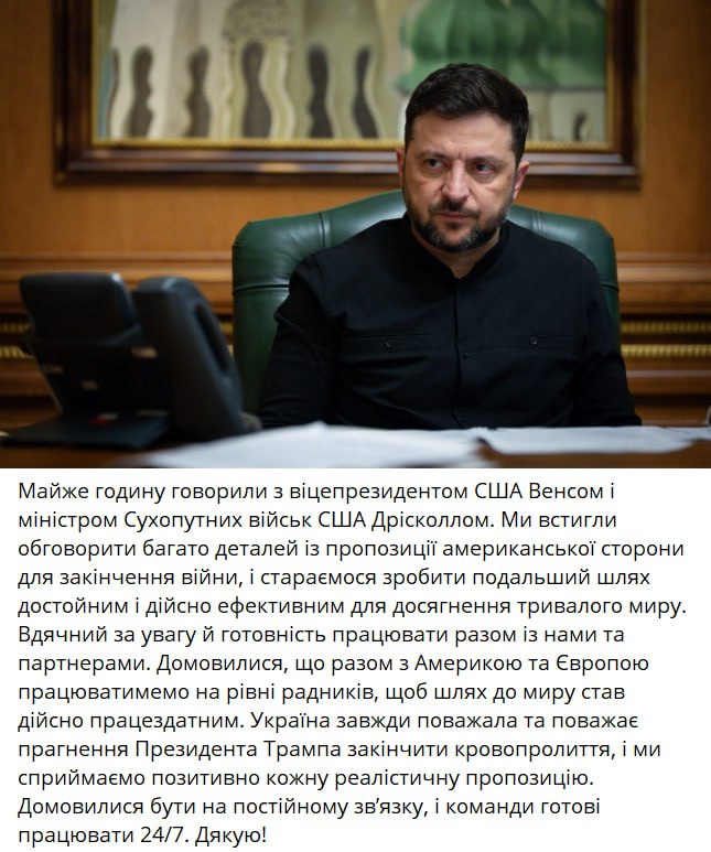 "Майже годину розмовляли з віце-президентом США Венсом і міністром Сухопутних військ США Дрісколом. Ми встигли обговорити багато деталей пропозиції американської сторони після закінчення війни і намагаємося зробити подальший шлях гідним і дійсно ефективним для досягнення міцного світу. Вдячний за увагу і готовність працювати разом з нами та партнерами. шлях до світу став справді працездатним. Україна завжди поважала і поважає прагнення президента Трампа покласти край кровопролиттю, і ми позитивно сприймаємо кожну реалістичну пропозицію.