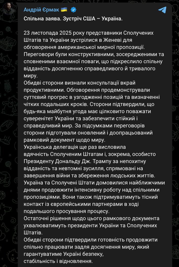 "23 листопада 2025 року представники Сполучених Штатів та України зустрілися в Женеві для обговорення американської мирної пропозиції. Переговори були конструктивними, зосередженими та виконаними взаємної поваги, що наголосило на спільній прихильності до досягнення справедливого та тривалого світу.