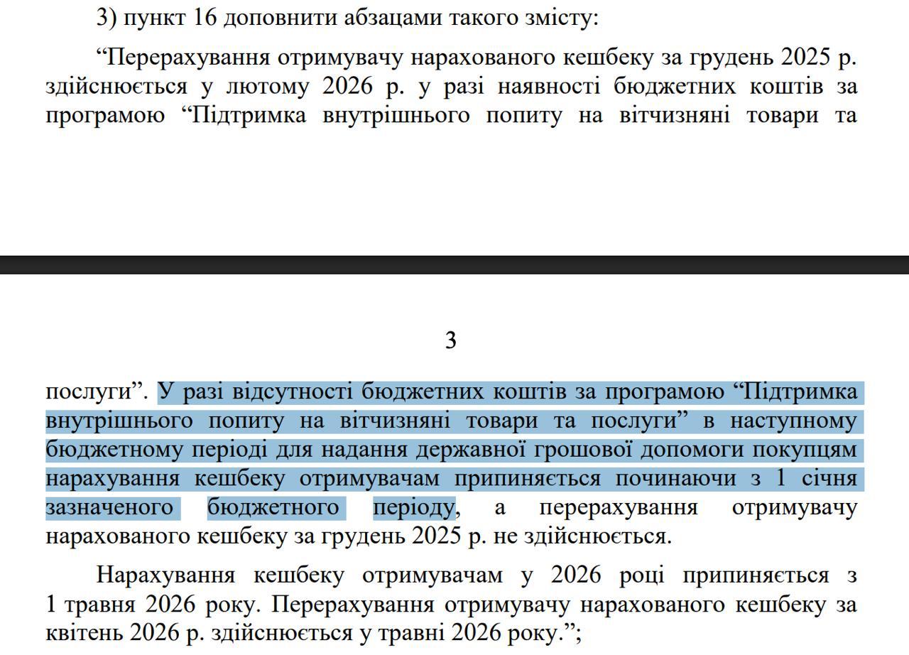 "У разі відсутності бюджетних коштів за програмою у наступному бюджетному періоді для надання державної грошової допомоги покупцям нарахування кешбеку одержувачам припиняється починаючи з 1 січня бюджетного періоду, а перерахування за грудень не провадиться", - йдеться у постанові.