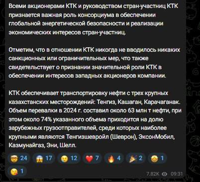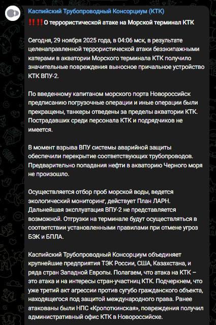 Сьогодні вночі під час атаки безпілотних катерів було знищено причал для завантаження нафти в Новоросійську, що належить Каспійському трубопороводному консорціуму (КТК). Він забезпечує 80% експорту казахської нафти.