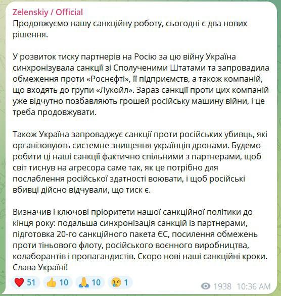 "У розвиток тиску партнерів на Росію за цю війну Україна синхронізувала санкції зі Сполученими Штатами і ввела обмеження проти "Роснефти", її підприємств, а також компаній, що входять до групи "Лукойл". Зараз санкції проти цих компаній вже відчутно позбавляють гроші російську військову машину, і це необхідно продовжувати", - пише Зелен.