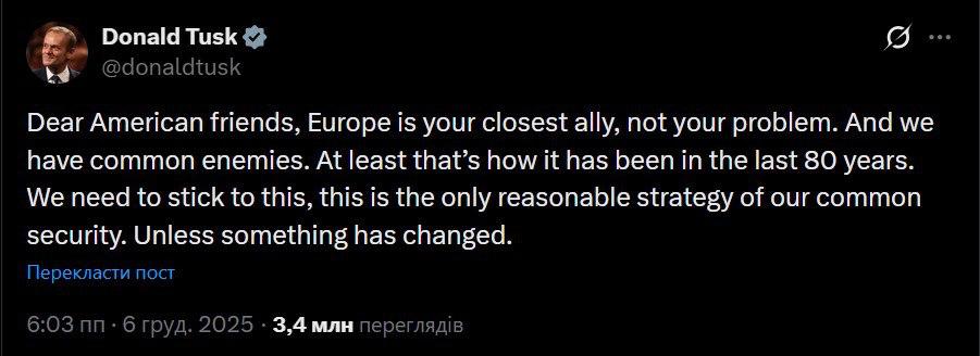 Прем'єр-міністр Польщі Дональд Туск звернувся до американців щодо нової політики Білого дому, яка критикує Європу та закликає до стабілізації відносин із Росією. Туск нагадав, що Європа залишається "найближчим союзником" Вашингтона, а не "проблемою".