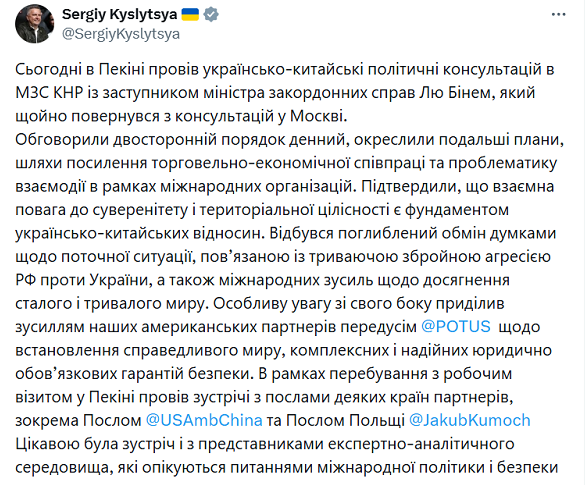 Заступник глави МЗС України Сергій Кислиця прилетів до Китаю, де зустрівся з послом США Девідом Пердью та заступником міністра закордонних справ КНР Лю Бінем.