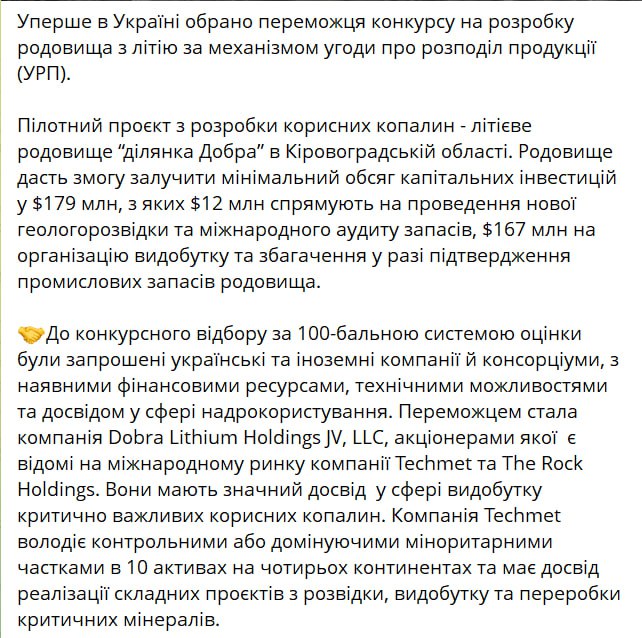 За словами Свириденка, переможцем стала компанія Dobra Lithium Holdings JV, LLC, акціонерами якої є компанії Techmet та The Rock Holdings.