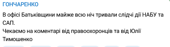 Перед цим народний депутат від партії "Євросолідарність" Олексій Гончаренко повідомив у своєму телеграм-каналі, що НАБУ та Спеціалізована антикорупційна прокуратура (САП) майже всю ніч проводили обшуки в офісі "Батьківщини".