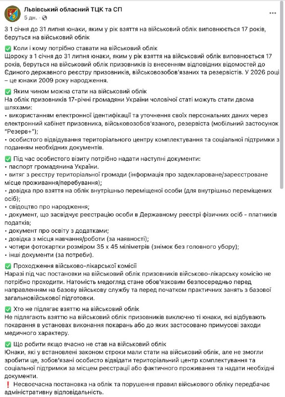 11:34 Львівський ТЦК вже починає нагадувати юнакам, яким цього року виповниться 17 років, що до 31 липня їм потрібно стати на військовий облік.