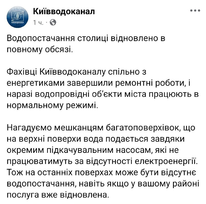 При цьому він попереджає, що на верхніх поверхах вода може бути відсутнім або доходити в малих об'ємах через те, що на верхні поверхи подають її насоси, які не працюють під час екстрених відключень.
