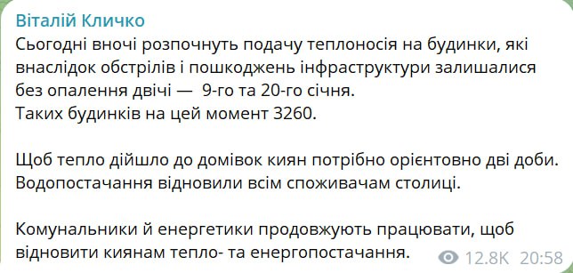 21:11 У Києві без тепла залишаються 3260 будинків, ним почнуть відновлювати теплопостачання вночі, заявив мер Кличка.