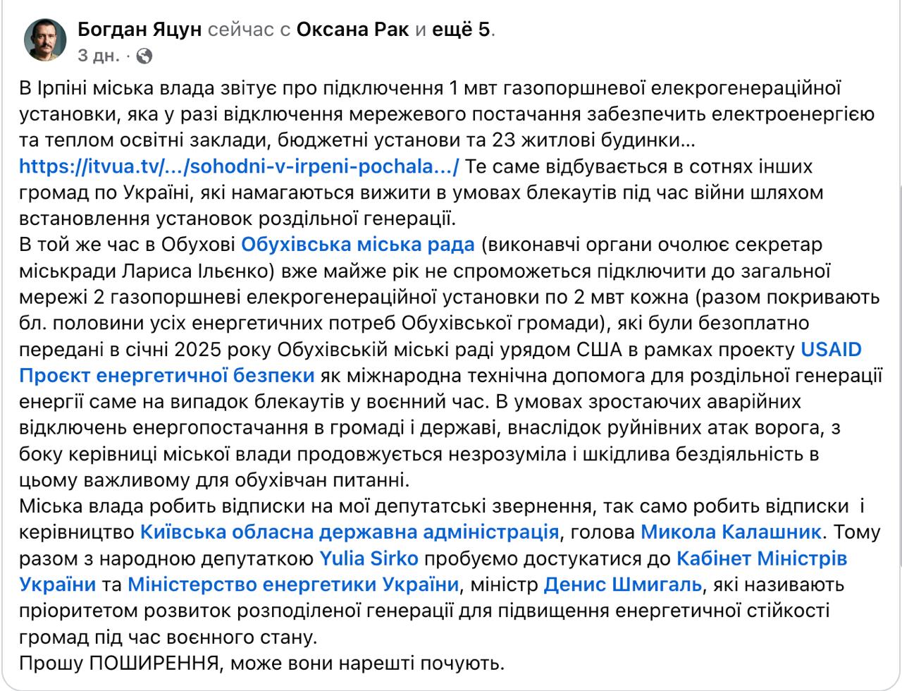 За його словами, дві передані США газопоршневі електрогенераційні установки по 2 МВт кожна покрила половину потреб громади. Вони були подаровані міськраді у січні 2025 року урядом США в рамках проекту USAID, але з того часу так і не були запущені навіть за умов блекаутів.