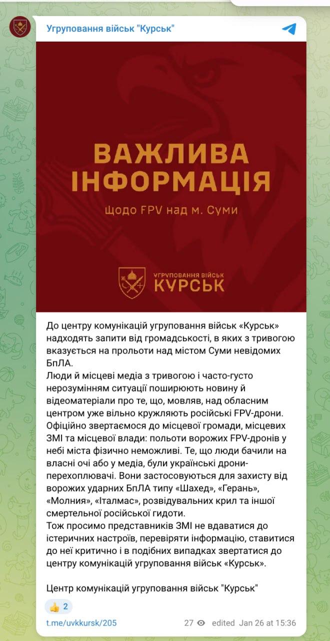 "До центру комунікацій угруповання військ "Курськ" надходять запити від громадськості, в яких з тривогою вказується на прольоти над містом Суми невідомих БпЛА. Польоти ворожих FPV-дронів у небі міста фізично неможливі. Те, що люди бачили на власні очі чи в медіа, – це були українські дрони-перехоплювачі. Тому просимо представників ЗМІ не піддаватися істеричним настроям", - заявили військові.