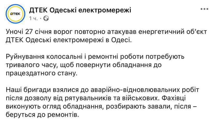 10.31 В Одесі вночі був повторний приліт об'єктом енергетики, "руйнування колосальні", ремонт займе тривалий час, повідомляє ДТЕК.