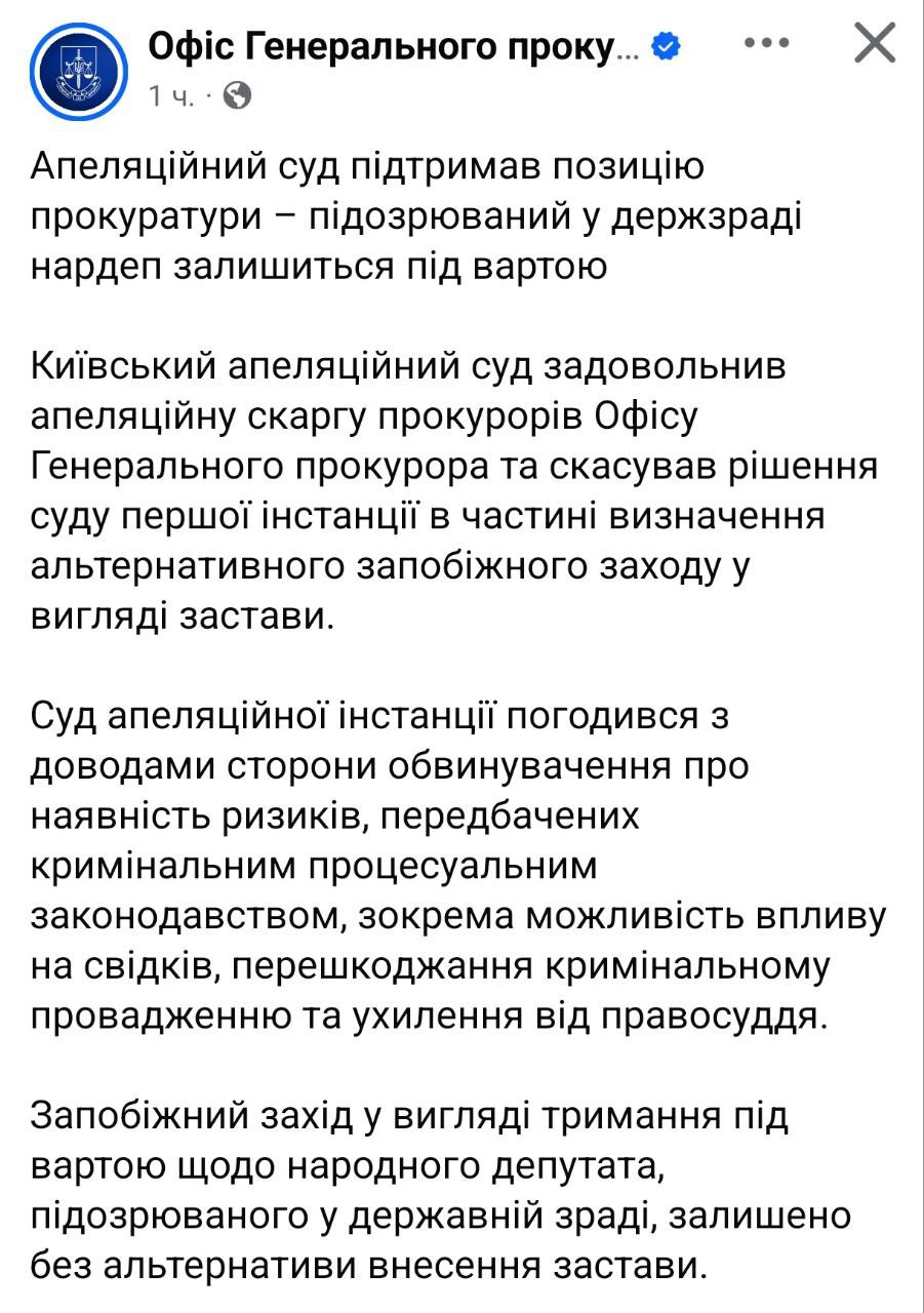 Рішення суду першої інстанції про можливість внесення застави для підозрюваного у державній зраді народного депутата було скасовано.