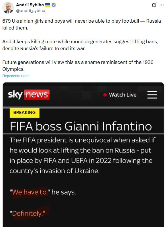 Глава Міністерства закордонних справ України Андрій Сибіга назвав президента Міжнародної федерації футболу (ФІФА) Джанні Інфантіно "моральним дегенератом" за його заклик скасувати заборону на участь російських команд у міжнародних турнірах.