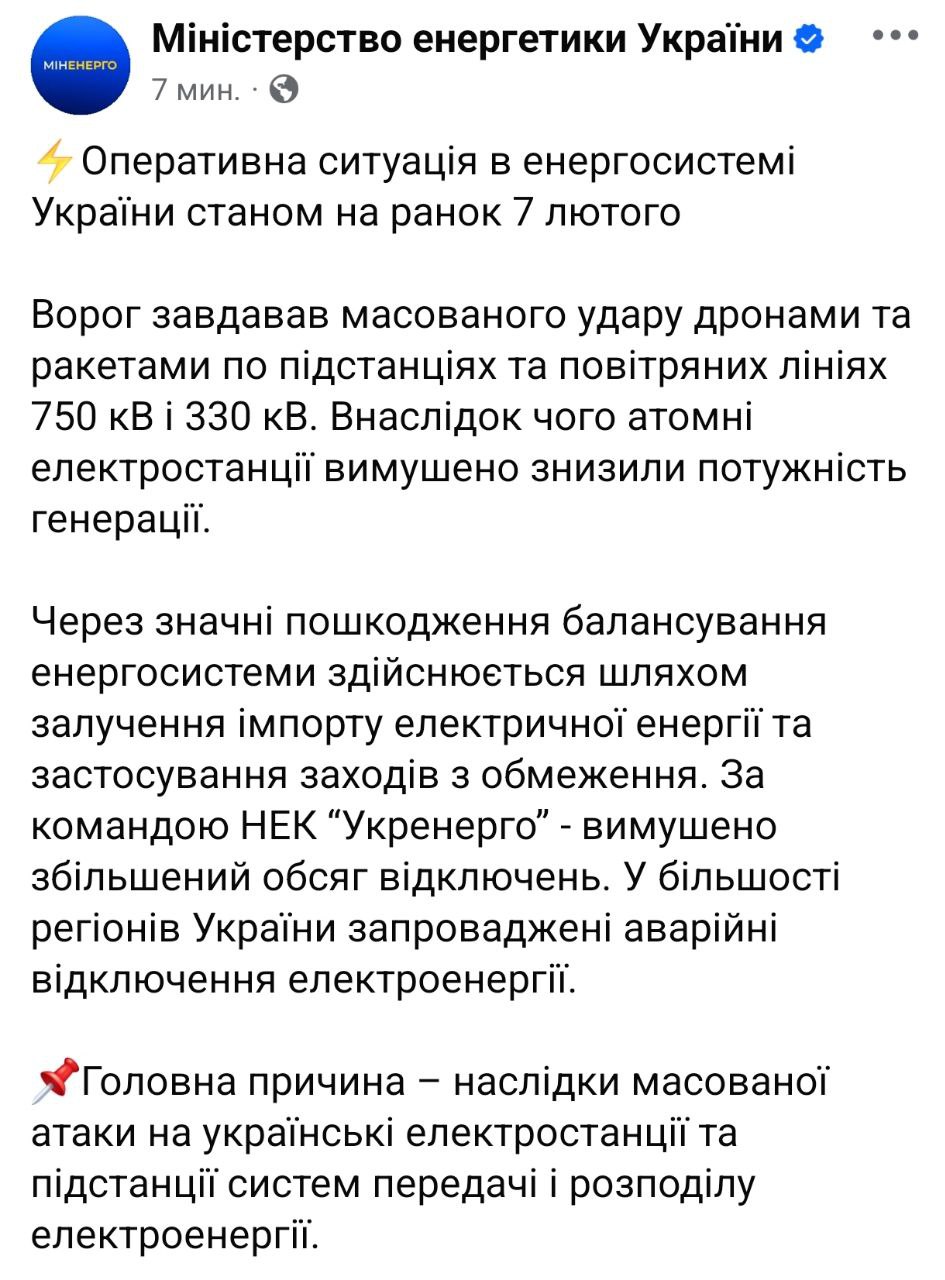 "Ворог наносив масований удар дронами і ракетами по підстанціям і повітряним лініям 750 кВ і 330 кВ. В результаті атомні електростанції вимушено знизили потужність генерації. Через значні пошкодження балансування енергосистеми здійснюється шляхом залучення імпорту електроенергії і застосування заходів з обмеження. регіонів України запроваджено аварійні відключення електроенергії", - заявили в міністерстві.