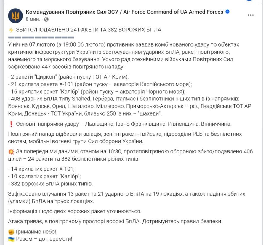 Тим часом, як повідомляють Повітряні сили ЗСУ, українська ППО збила вночі та вранці 24 ракети з 39-ти.