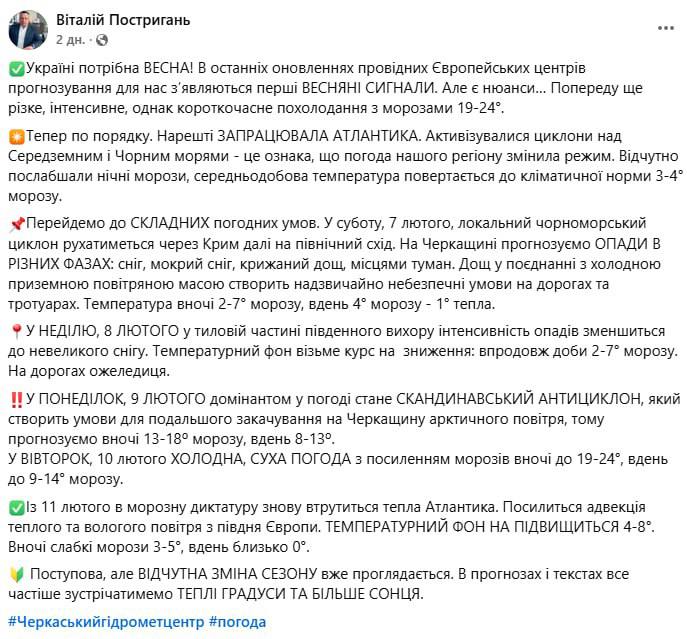 У вівторок, 10 лютого холодна, суха погода з посиленням морозів вночі до 19-24°, вдень до 9-14° морозу. З 11 лютого морозну диктатуру знову втрутиться тепла Атлантика. Посилиться адвекція теплого та вологого повітря з півдня Європи. Температурний фон підвищиться, підвищиться 4-8°. Вночі слабкі морози 3-5°, вдень близько 0°", - пише Постригань.