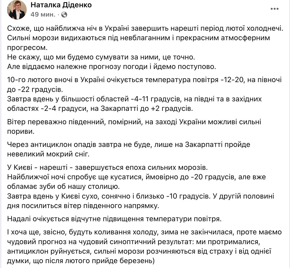 Такий прогноз дала у своєму Фейсбуці синоптик Наталка Діденко.