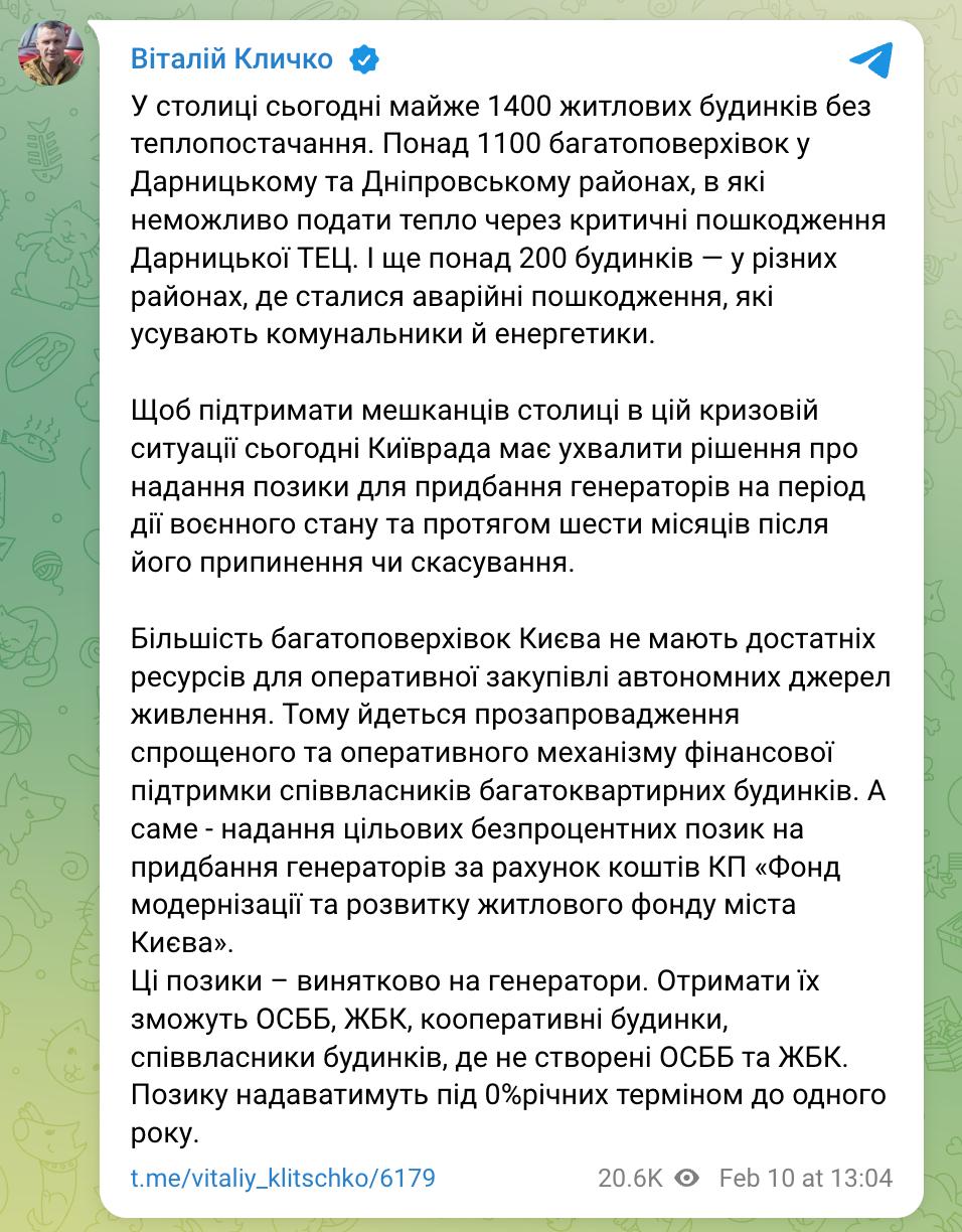 "Київрада має ухвалити рішення про надання позики на придбання генераторів на період дії військового стану і протягом шести місяців після його припинення або скасування. Йдеться про надання цільових безвідсоткових позик на купівлю генераторів за рахунок коштів КП "Фонд модернізації та розвитку житлового фонду міста Києва". Ці позики – виключно на генератори. Отримати їх зможуть ОСББ, ЖБК, кооперативні будинки, а також співвласники будинків, де не створено ОСББ та ЖБК. Позику надаватимуть під 0% річних строком до одного року", - написав мер Києва.