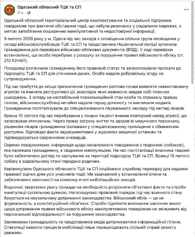 В обласному ТЦК сьогодні прокоментували резонансну історію і заявили, що чоловік розбив собі голову сам: "Громадянин раптово почав проявляти невмотивовану агресію і здійснювати деструктивні дії, в результаті яких навмисно завдав собі тілесні ушкодження. Враховуючи нестабільний психоемоційний стан особистості та отриману травму голови, військовослужбовці негайно надали першу допомогу та викликали медиків. Громадянина госпіталізовано до спеціалізованого лікувального закладу під нагляд лікарів.Вранці 10 лютого під час перебування у лікарні пацієнт скоїв повторний напад агресії, що загрожує оточуючим. Через пряму загрозу життю та здоров'ю медичного персоналу рішенням лікарів громадянина ізолювали у спеціалізованому приміщенні з обмеженим доступом".