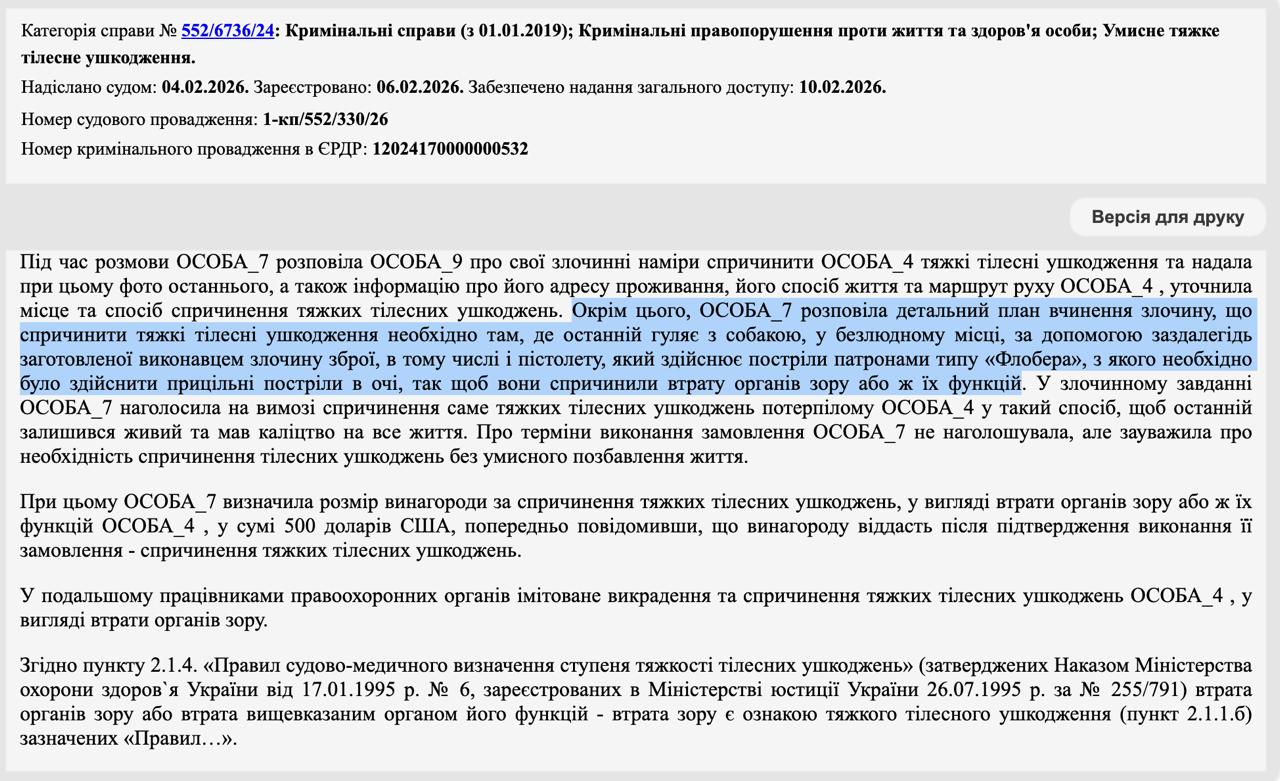 Проте суд кваліфікував її дії як організацію замаху на навмисне тяжке тілесне ушкодження на замовлення та призначив покарання у вигляді шести років та восьми місяців позбавлення волі.